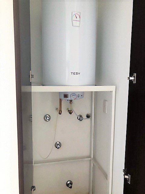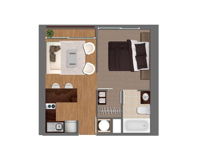 conecta con terraza con piso de cerámica, cocina americana también piso gres porcelánico, muebles en melamina y equipadas con campana, encimera y horno eléctrico, dormitorio alfombrado con baño completo en suite y walk in closet. Agua caliente por termo eléctrico individual, alarma de incendio accionada por detector de humo en cada piso, citofonia en cada departamento, ductos para TV Cable y teléfono.