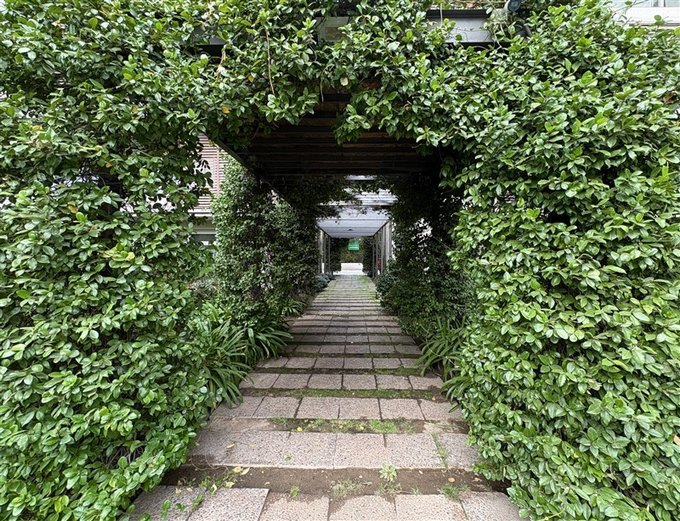 Áreas verdes, jardines y plaza frente al edificio