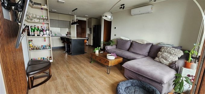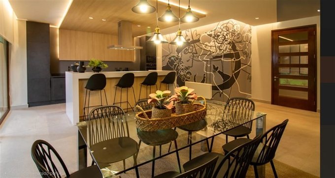 Living y comedor juntos, 2 dormitorios de muy buen tamaño, 1 en suite con walking closet, cocina integrada con isla, equipada con horno, campana, cocina, refrigerador, lavavajillas, instalación para lavadora, 2 baños completos, 2 terrazas, 1 de 19,70 m2 cerrada y otra en piso de arriba de 49.43 m2.