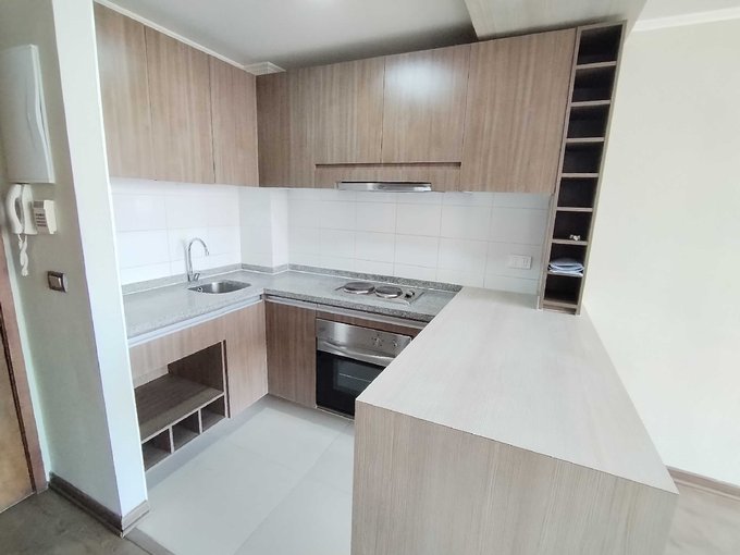Cocina amoblada y equipada con horno, campana y cocina encimera. Agua caliente por termo eléctrico.