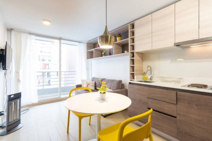 Está ubicado en una zona central y con alta conectividad (esquina de las calles San Francisco y Eleuterio Ramirez). El edificio está a minutos caminando de la estación del metro Universidad de Chile , por lo tanto, su ubicación es perfecta para moverse a pie al centro de la ciudad, incluidos importantes puntos financieros y turísticos (Barrio Lastarria, Casa de la Moneda, Parque Forestal, Parque Almagro) El departamento de 35 metros cuadrados es luminoso y está orientado hacia un patio interior, por lo que es bastante silencioso durante el día y la noche, a pesar de encontrarse en una esquina concurrida de Santiago. Cuenta con cocina americana, la cual se encuentra totalmente equipada: horno eléctrico, campana, encimera eléctrica, cubierta de granito El dormitorio en suite es de buen tamaño permitiendo la instalación de una cama de dos plazas más dos veladores. El edificio tiene solo 6 años y posee servicios de alto nivel, lavandería, piscina, Quinchos, sala de pool, Gimnasio, sala de cine (Inmobiliaria Imagina).